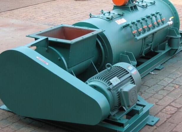 粉塵加濕機 在料斗下部,進料缸與混合缸同軸互通。主軸位于混合缸和進料缸內。主電機帶動主軸轉動。單軸粉塵加濕器安裝在進料缸的主軸上,并圍繞主軸。所述螺桿推桿固定,攪拌